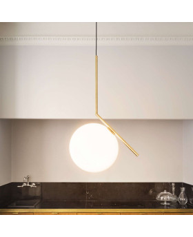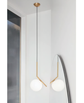 Possède un diffuseur sphérique en verre opalin soufflé, délicatement suspendu en équilibre.