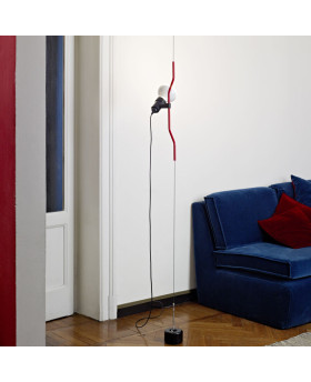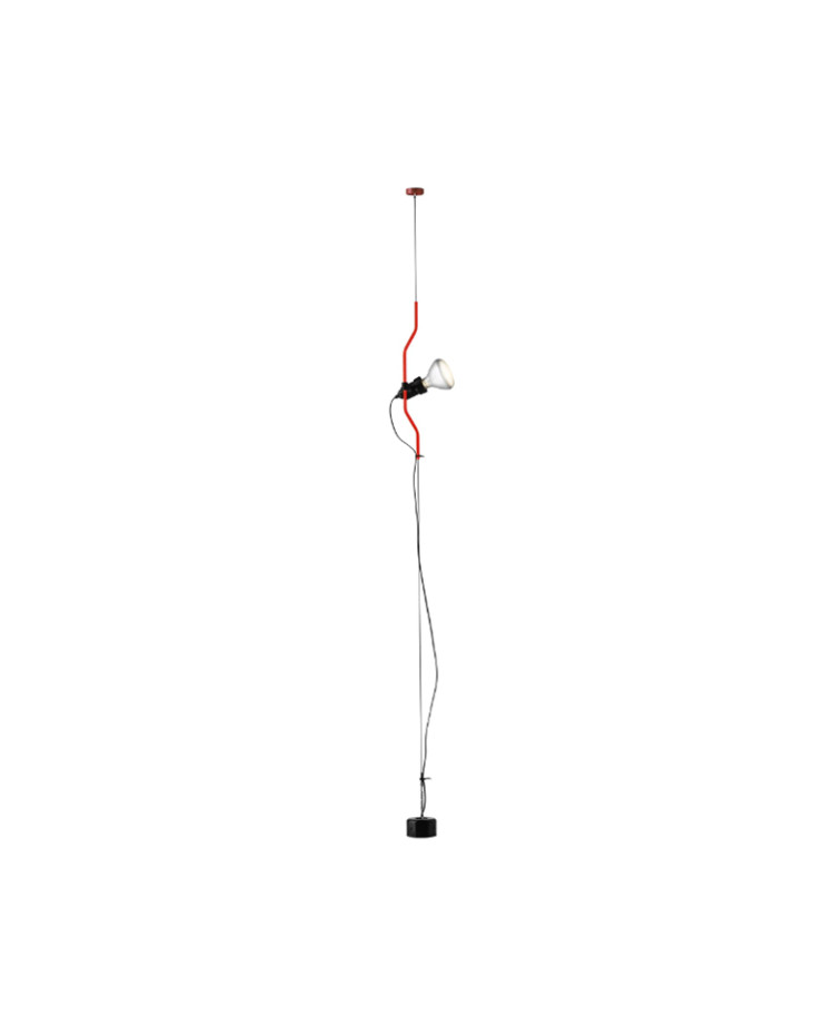 Sa hauteur est facilement réglable grâce à un tube en acier profilé, peint à la main ou nickelé, qui coulisse le long d’un câble en acier tendu du plafond au sol (longueur utile : 4 m).
