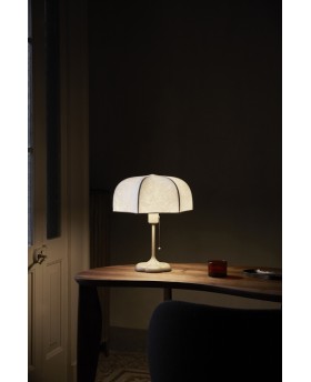 Grâce à un procédé ingénieux où du tissu liquide est délicatement pulvérisé sur sa base en aluminium coulé, cette lampe dévoile un abat-jour translucide qui se déploie avec grâce sur de délicats arceaux en acier.