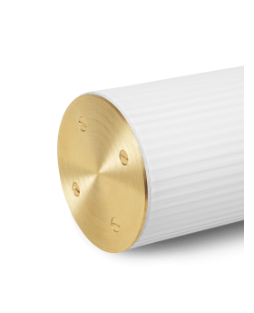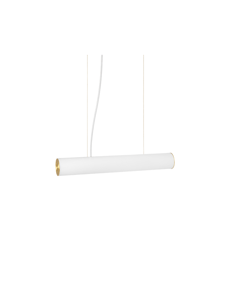 Cette lampe en forme de tube cylindrique est composée d'un tube en verre opale soufflé à la bouche et orné de rondelles en laiton massif à chaque extrémité.